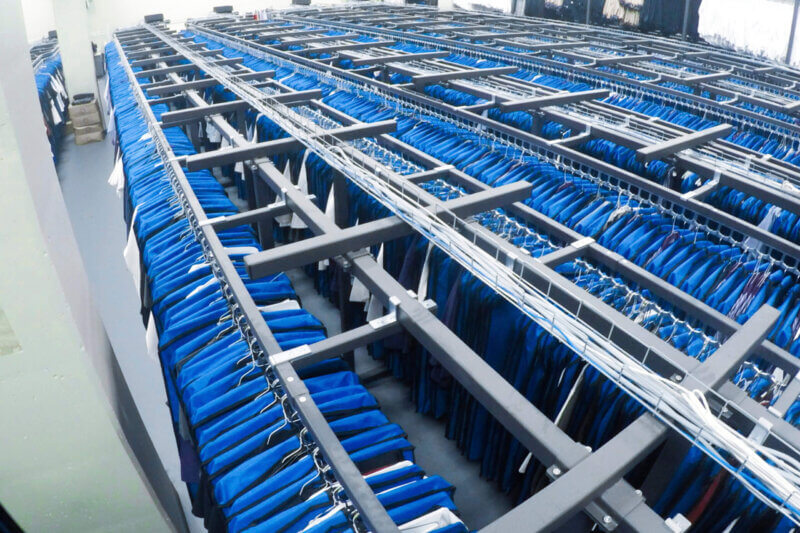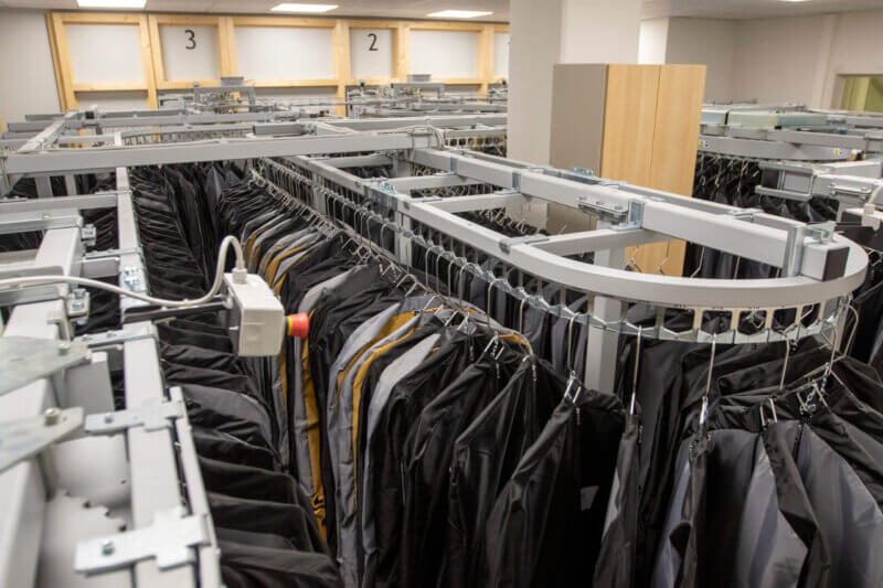 Das computergestützte Verwaltungssystem ermittelt die entsprechende saubere Kleidung und das Förderband transportiert sie zu einem der Ausgabeschalter.